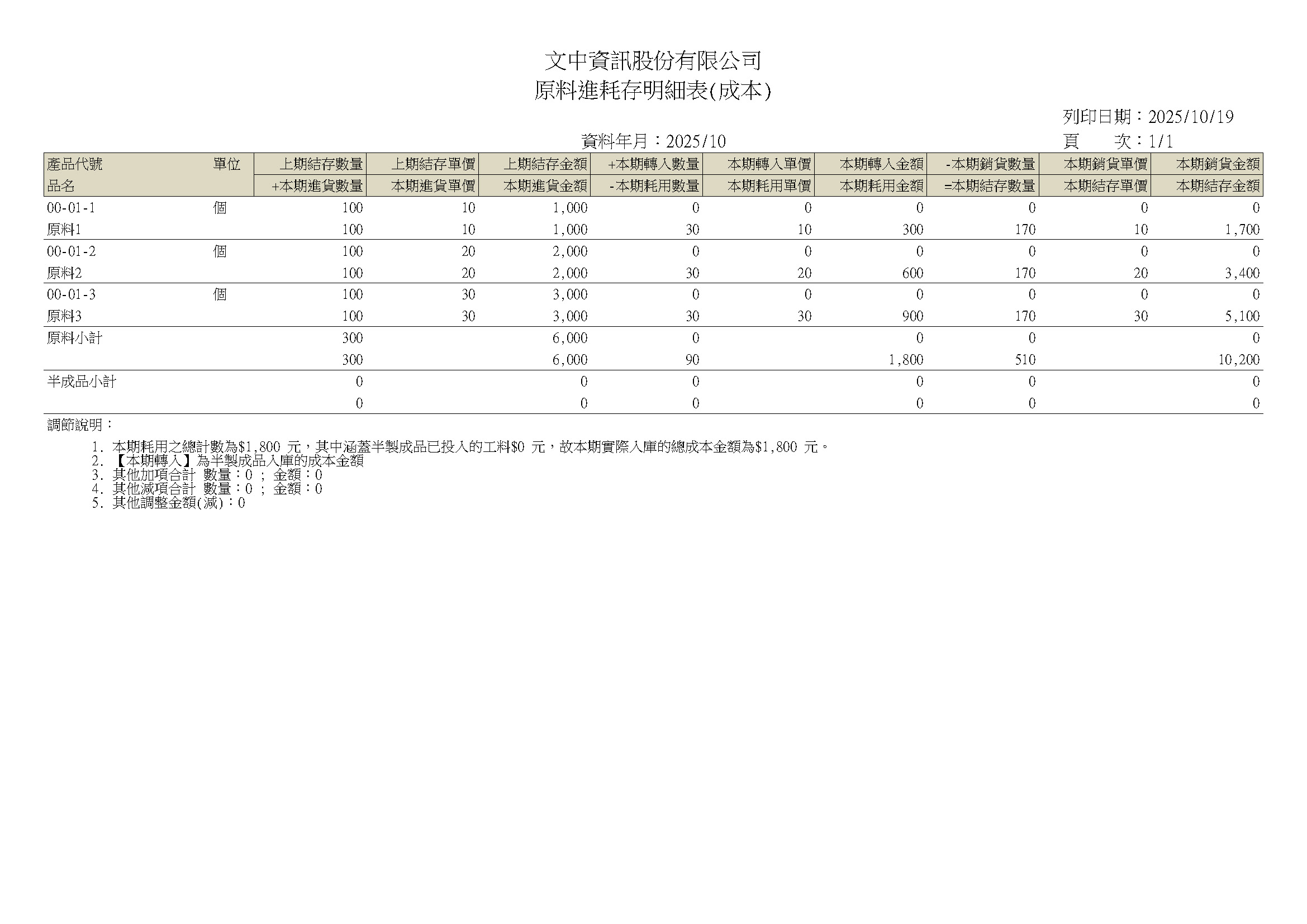 原料進耗存明細表(成本)